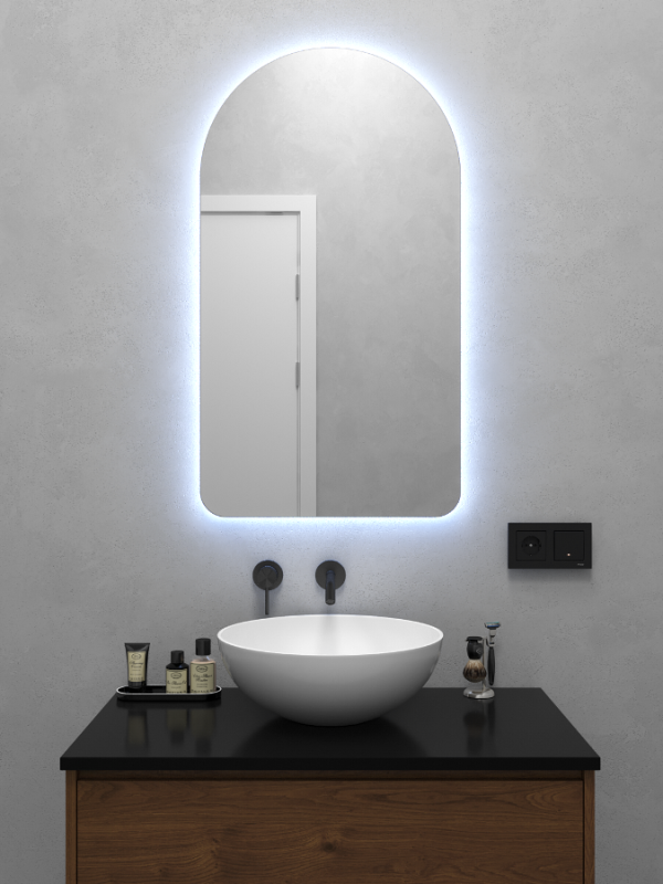 Безрамное зеркало арочной формы с контурной (тыльной) холодной подсветкой, свет 6000К. Подложка из высококачественного МДФ, светодиодная лента защищена матовым свето-рассеивателем от попадания пыли и влаги. Есть вывод 220W для подключения к сети, включение подсветки от выключателя на стене, либо от розетки.
